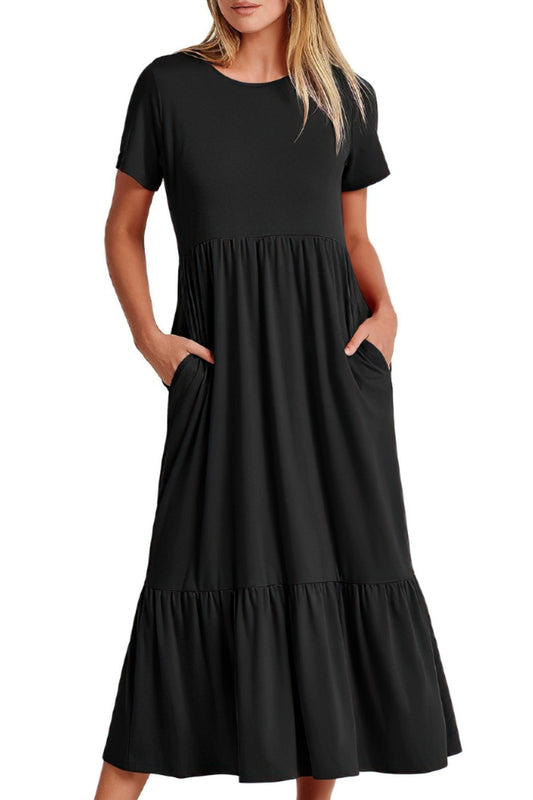 Crew Neck Short Sleeve Midi Dress with Pockets