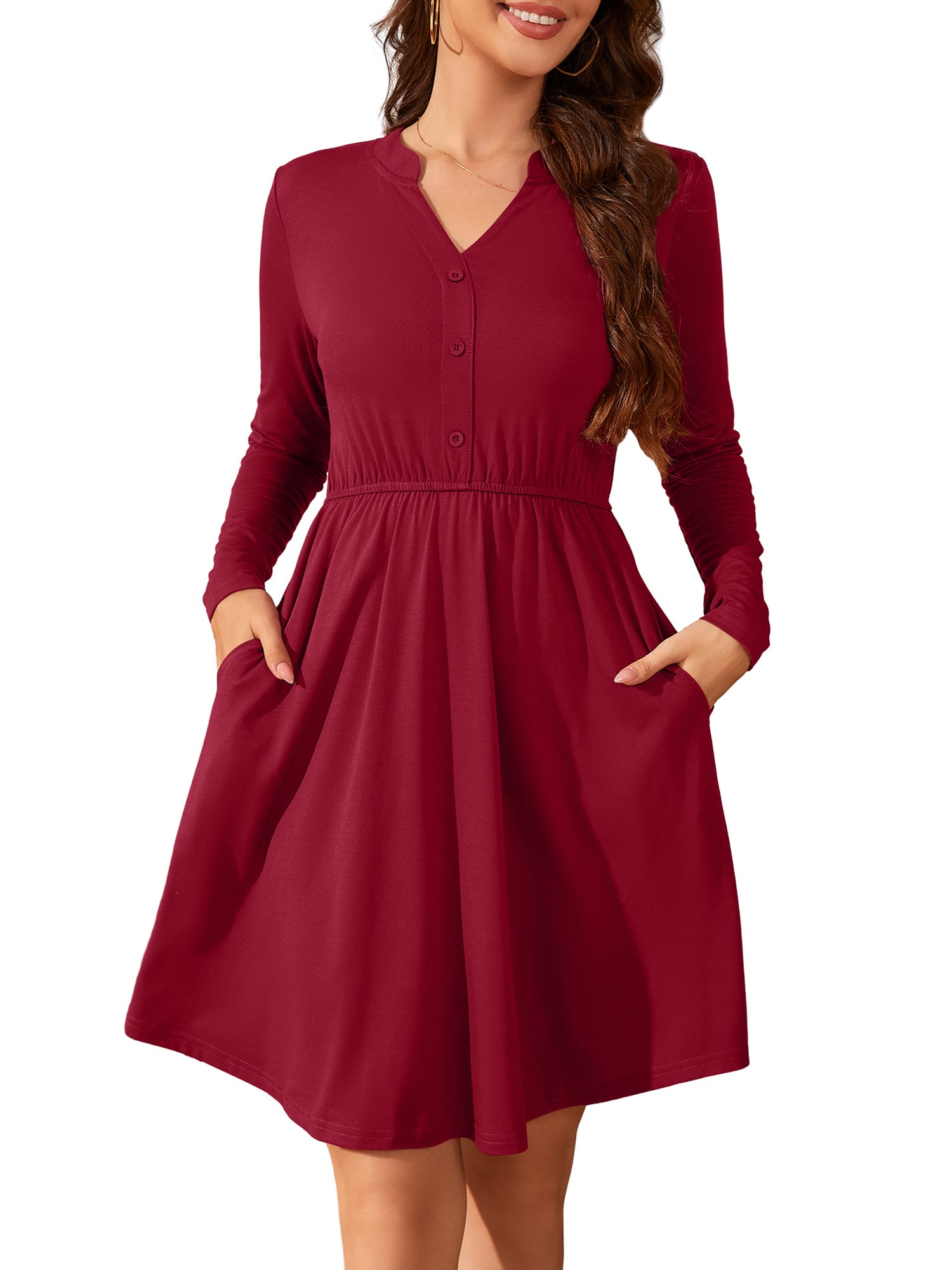 Plus Size Dresses for Women Long Sleeve Loose V Neck Button Flowy Aline Pleated Dress with Pockets